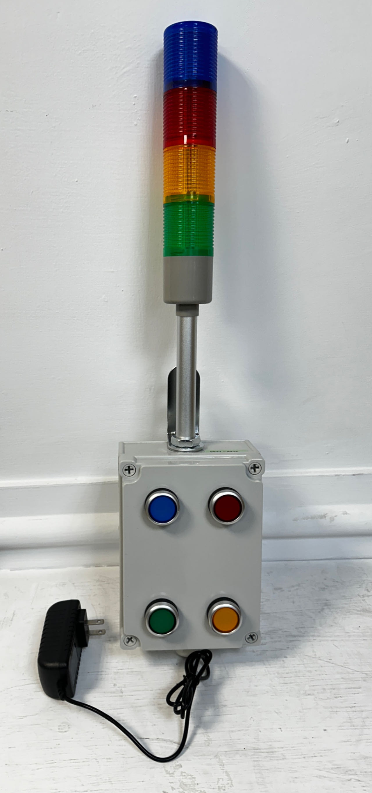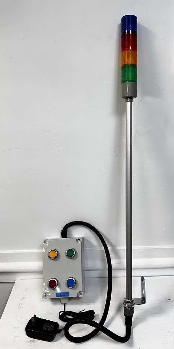 亦可選用發射器與接收燈號分離款 工作模式:壓下按鍵1~4,綠/黃/紅/藍燈亮(響警笛聲),同時發出相關無線訊號,在手錶機及無線顯示器設同步顯示相關文字訊息,再按一下取消鍵,清除所有燈號及文字訊息